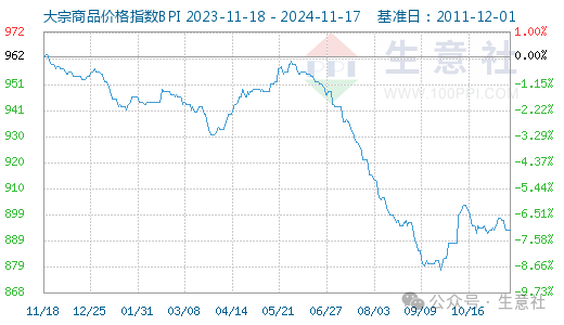 11月17日大宗商品价格指数BPI为893点,与昨日持平,较周期内最高点1343点(2021-10-19)下降了