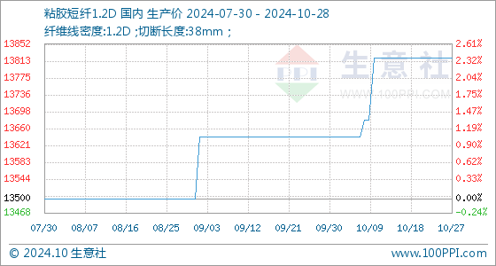 10月28日,生意社粘胶短纤1.2D基准价为13820.00元/吨,与本月初(13640.00元/吨)相比,上涨了1.32%。
