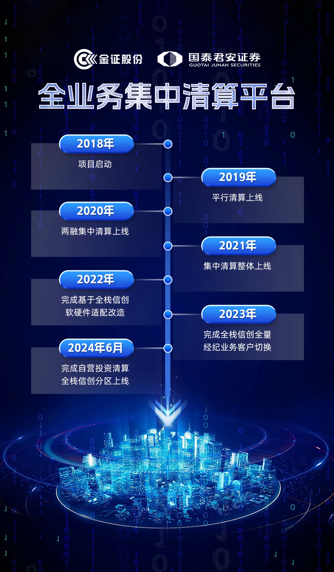 平台在2019年完成开发上线启动平行清算,2020年完成两融客户切换上线,2021年完成全量经纪业务客户切换上线,2022年完成基于全栈信创软硬件适配改造,2023年完成全栈信创全量经纪业务客户切换,2024年6月完成自营投资清算全栈信创分区上线。