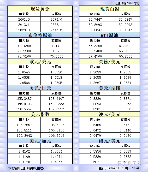 汇通财经APP讯——11月18日欧市更新的黄金、白银、原油、美元指数、欧元、英镑、日元、瑞郎、澳元、加元、纽元支撑阻力位一览。