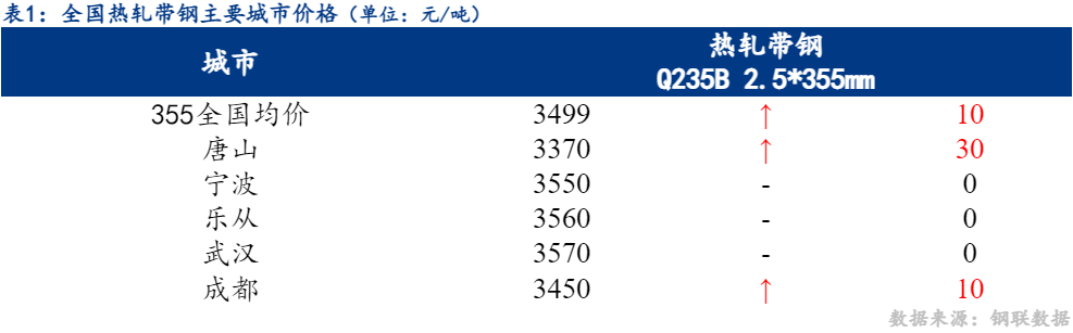 18日热轧带钢全国主要城市价格主稳个涨,截至发稿时2.5*355mm热轧带钢均价3499元/吨,较上周五上涨10元/吨,其中2.5*355mm主要城市报价为唐山3370元/吨,宁波3550元/吨,乐从3560元/吨。