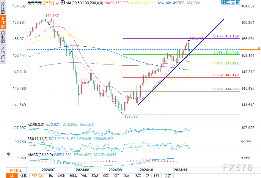 在接近5月底的高点157.70之后,美元/日元在10月28日的高点153.88附近稍作喘息。进一步的小支撑位见于10月23日的高点153.19,如果进一步下行,将沿200日移动均线跌至151.82。