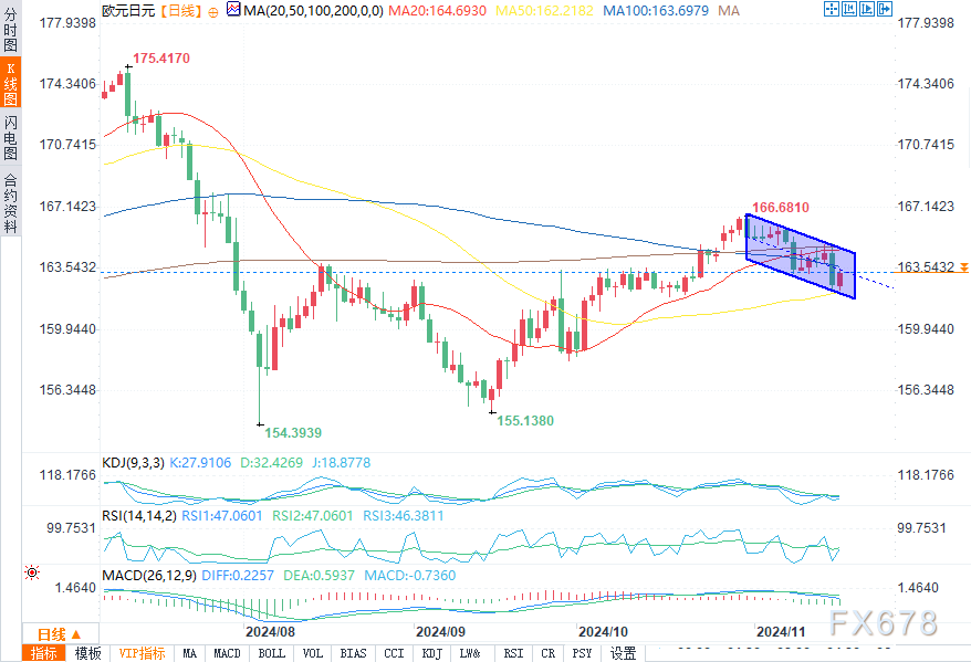 欧元/日元继续在11月下行通道内交易,下方通道位于162.13,在55日移动均线161.90和10月中旬最低价161.85之间提供潜在的小支撑。如果继续下跌,价格可能会重新测试160.00一线。