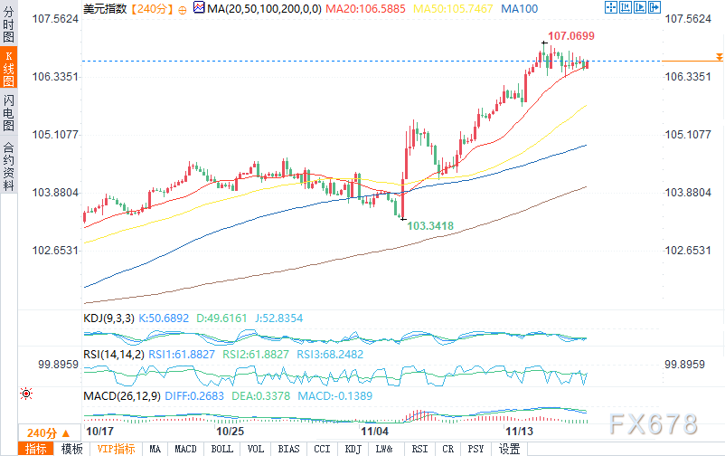 汇通财经APP讯——周一(11月18日)欧盘时段,美元指数维持波动,盘中报106.5959,跌幅0.07%。