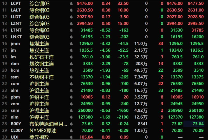 黑色系均飘绿,铁矿跌3%。螺纹、热卷跌幅分别为2.29%、1.93%。不锈钢跌1.94%。双焦方面,焦煤跌3.32%,焦炭跌4.56%。