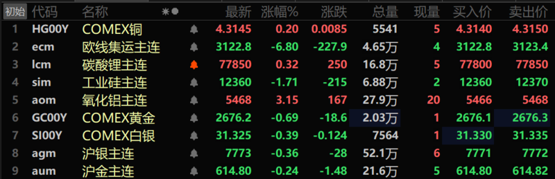 截至午间收盘,内盘基本金属近全线下跌,仅沪铅涨0.12%。沪镍跌1.69%,沪铝跌0.83%。沪铜跌0.96%,沪锡跌0.63%,沪锌跌0.95%。氧化铝延续前6个交易日的涨势继续涨3.15%,盘中刷新历史新高至5477元/吨。此外,碳酸锂涨0.32%,工业硅跌1.71%。