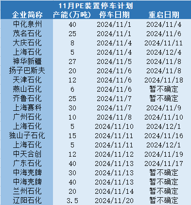 11月PE生产企业密集停车检修,部分前期停车装置重启,预计装置检修损失量较10月变化在-1.22至1.51万吨左右。同时,考虑到新产能的投放以及天数变化,预计11月PE产量在225.95至229.52万吨。10月、11月有较多停车装置将于12月重启,预计12月检修损失量将较11月及去年同期有所下降,供应压力预计加剧。随着供应端回归、下游农膜旺季结束,库存有累库预期。