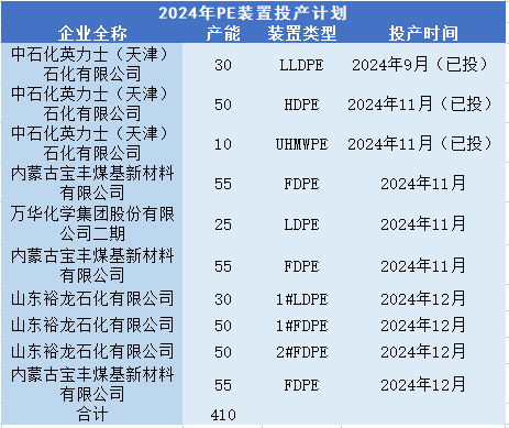 2024年中国PE计划投放410万吨产能(不含EVA装置20万吨),其中有380万吨计划于11月、12月投放。11月,中石化英力士已投放两套共60万吨装置,于中旬开始产出;内蒙古宝丰、万华化学还有三套共135万吨装置的投放计划。从以往经验看,集中投产将导致供应压力加剧,部分装置预计延期至12月投放。12月,山东裕龙、内蒙古宝丰计划投放四套共185万吨装置,投产压力显著,部分装置延期至2025年投产概率较大。但总体来看,产能投放将对11月、12月聚乙烯供应带来增量影响。