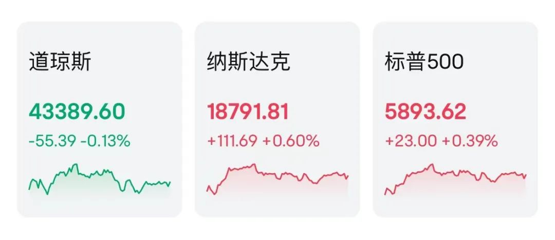 当地时间11月18日,美股三大股指涨跌不一,截至收盘,道指跌55.39点,跌幅为0.13%,报43389.60点;纳指涨111.69点,涨幅为0.60%,报18791.81点;标普500指数涨23.02点,涨幅为0.39%,报5893.62点。