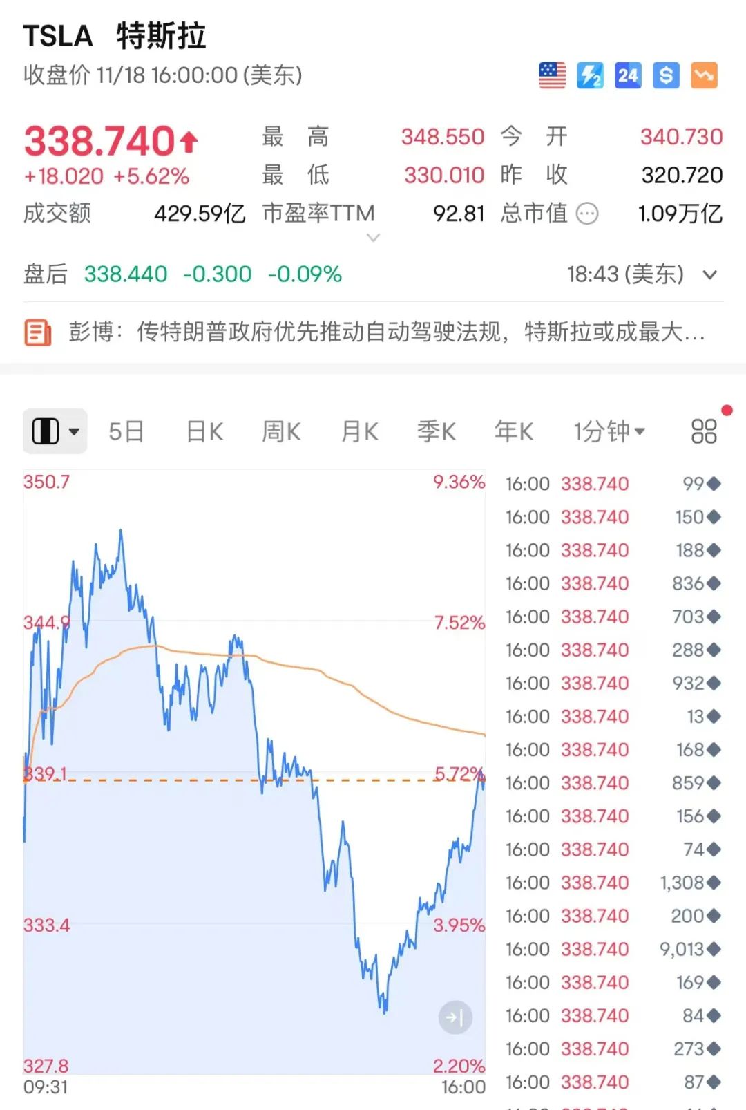 当地时间11月18日,特斯拉的股票大涨超5%,报338.74美元,最新总市值为1.09万亿美元。