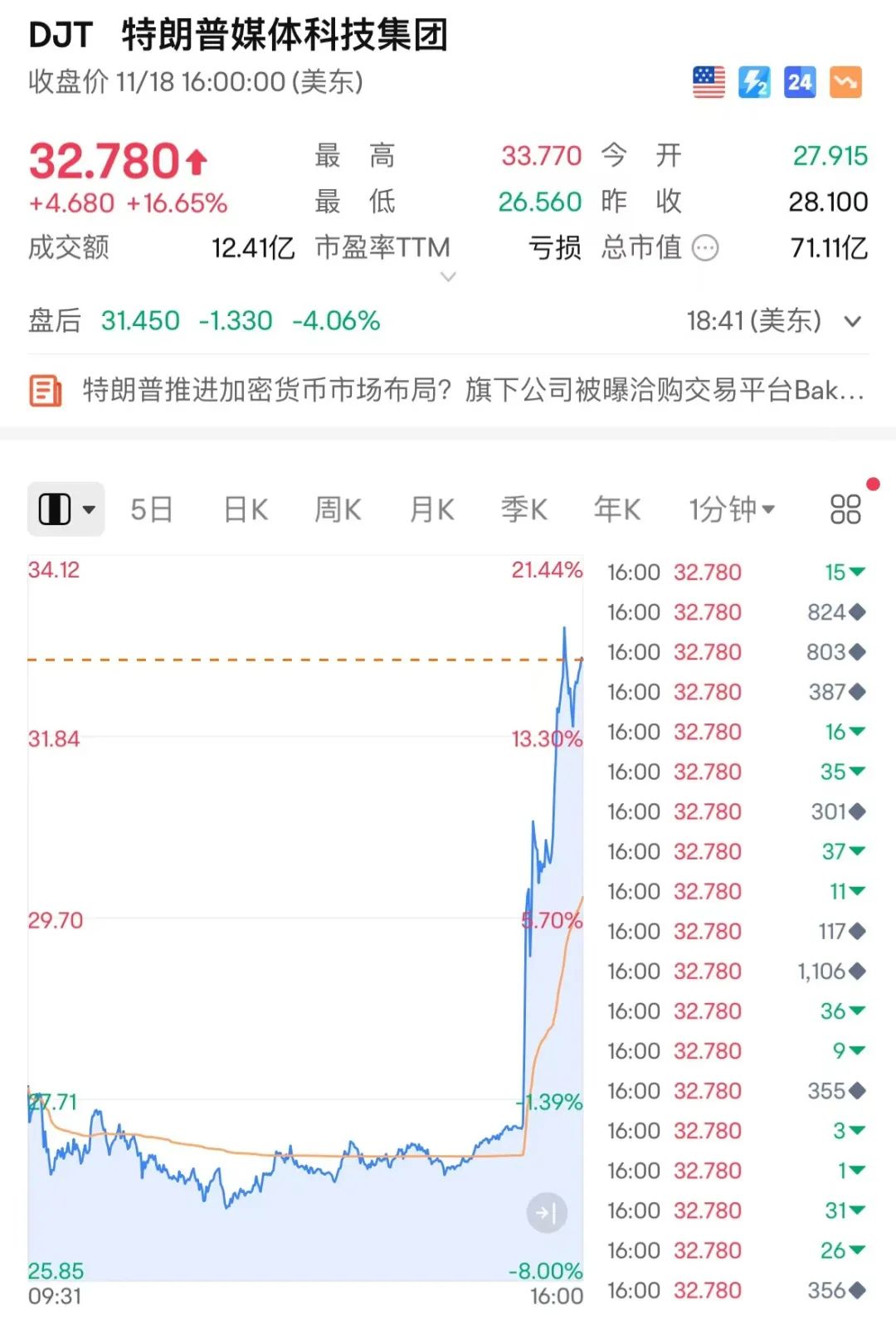 同时,特朗普媒体科技集团(DJT)的股票大涨超16%。