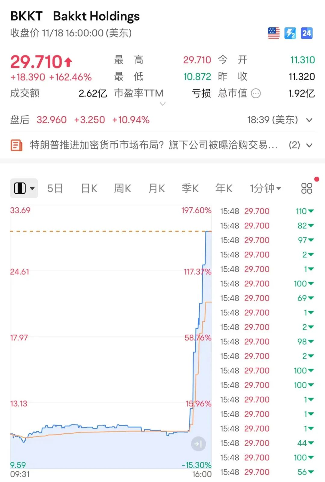 受此消息影响,美股Bakkt尾盘数次熔断,收盘涨超160%。