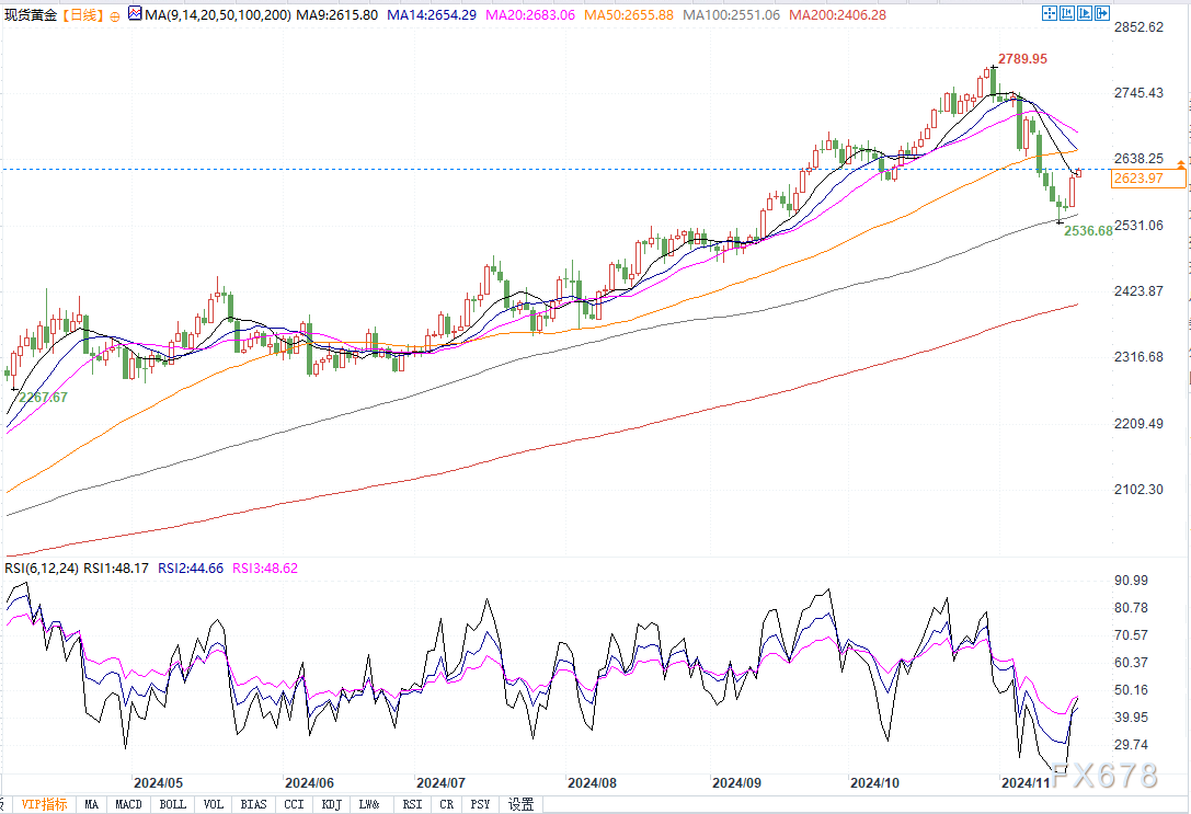 北京时间11月19日11:25,现货黄金报2623.73美元/盎司