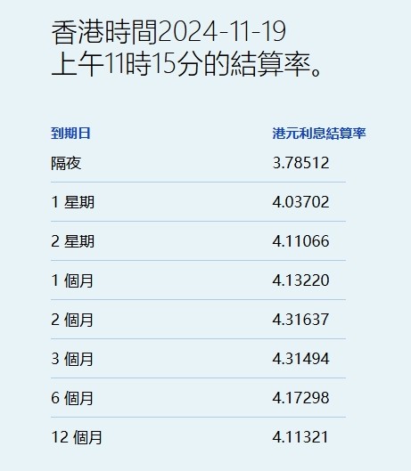 11月19日,港元拆息今日个别发展,其中,隔夜息下跌11基点至3.78512%,为11月7日以来最低,与楼按相关的一个月拆息则微升至4.1322%。反映银行资金成本的三个月拆息跌至4.31494%,见近一周新低。六个月拆息降至4.17298%,一年期则升至4.11321%。