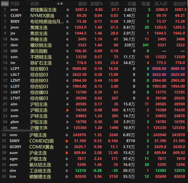 碳酸锂主连涨3.96%,工业硅主连跌0.28%,欧线集运涨0.85%。