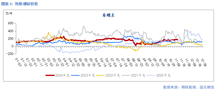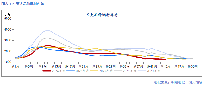宏观情绪退温:海外方面,美国大选与利率决议两大事件落地后。11月美联储降息25基点,后市对美联储降息的预期有所下调。特朗普政府对中美贸易的关税政策,或影响钢材间接出口,对钢价中性偏空。国内方面,11月8日超10万亿元财政政策方案出台,方案整体超过市场预期,减轻地方财政压力,对市场中长期利好。