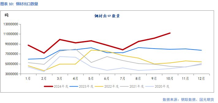 海关总署11月7日数据显示,2024年10月中国出口钢材1118.2万吨,较上月增加102.9万吨,环比增长10.1%;1-10月累计出口钢材9189.3万吨,同比增长23.3%。