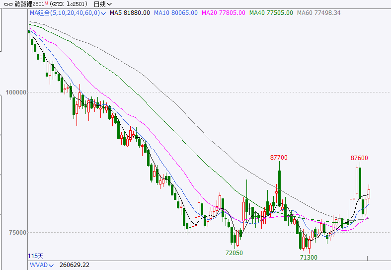 碳酸锂2501主力合约高开高走,午后继续快速上行,一度涨幅超5%。今日收盘报82650元/吨,涨幅3.96%