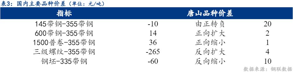 355mm带钢与钢坯市场价格价差反向缩小10元/吨,螺带差反向扩大4元/吨。