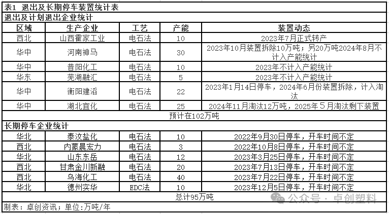 随着近年行业供需矛盾加剧,行业运行情况转差,PVC粉供应端开始自发调整。2023年开始部分产能逐步退出行业,2023-2024年PVC粉退出产能预计在102万吨,有部分产能装置已经拆除,企业装置淘汰,有部分装置转产其他产品。除此之外,从2022年开始,部分PVC粉装置处于长期停车的状态(主要统计停车且开车时间不定的装置),长期停车产能在95吨。退出及长期停车产能主要涉及成本及竞争优势相对偏弱的装置,虽然涉及12家生产企业,但因为多数产能相对较小,所以总共预计在197万吨,这说明行业已经开始在进行产能的自发优化调整,但调整速度相对偏慢。