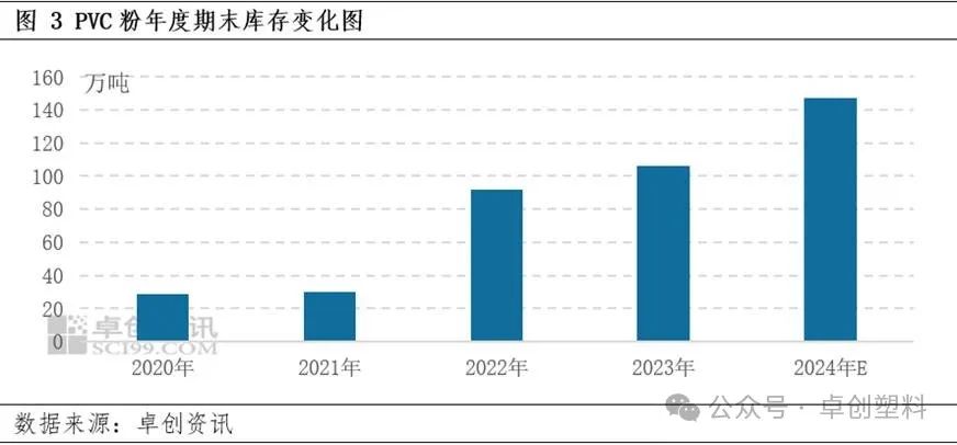 之所以从2022年开始PVC粉市场运行情况转差,主要是因为社会库存大幅增加,2023-2024年仍呈现增加趋势,预计2024年期末库存将接近150万吨。库存作为供需博弈的结果表现,说明从2022年开始PVC粉行业逐步供大于求,并且2023-2024年供需矛盾更加突出,供需矛盾成为市场运行的主逻辑,PVC粉市场承压运行。2022年开始PVC粉行业逐步供大于求,主要是因为供应端仍处在扩产周期,但需求端表现不佳,PVC粉需求跟地产行业密切相关,所以随着地产行业进入深度调整阶段,PVC需求增速放缓,行业逐步供大于求。