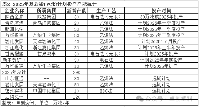 2022年开始中国PVC粉市场逐步供大于求,行业运行情况转差,PVC粉供应端进入优化调整阶段,从2023年开始部分产能逐步退出行业,但供应端新产能仍在陆续释放,PVC粉行业产能处于净增长状态。2025年PVC粉计划投产装置接近300万吨,行业供大于求状态难扭转。