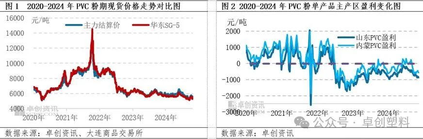 从2022年开始PVC粉价格震荡下跌,2023-2024年基本处于低位震荡状态,2022-2024年PVC粉整体价格重心逐年下移。因为PVC粉价格逐步走低,并且PVC粉价格下跌幅度大于成本跌幅,所以PVC粉产品盈利被压缩,2023年至今,PVC粉单产品多数时间处于亏损状态。