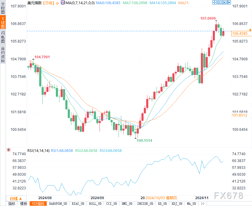 基本面因素显示,美国经济的强劲韧性令投资者对美联储在短期内维持高利率的预期保持谨慎。尽管市场对2024年年中的降息概率进行定价,但近期一系列强劲的经济数据削弱了这一预期。此外,知名机构的分析师指出,特朗普政府即将上任的财政团队将对未来的财政政策走向产生深远影响。特别是,如果财政政策的扩张性较为显著,可能进一步推高预算赤字,从而对美元形成更复杂的影响。