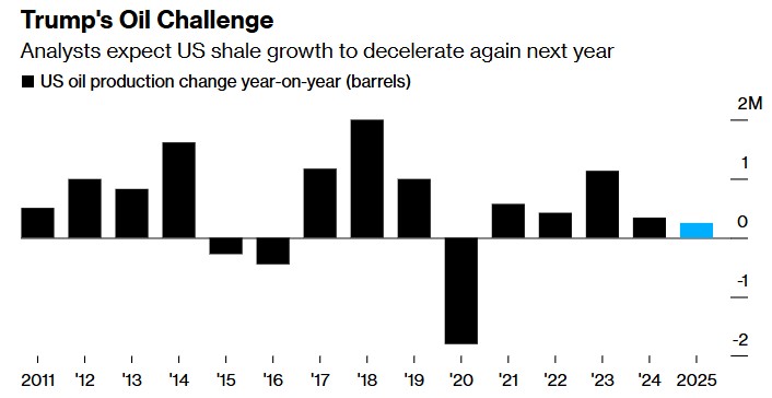 特朗普曾表示,他将推动美国页岩油公司提高产量——他告诉支持者油价也会下跌,即使这意味着生产商“因开采而倒闭”。但在他的第二个任期之前,美国的石油产量连续两年创下纪录。在这种背景下,接受机构调查的分析师和交易员预计,从今年年底到2025年,美国的石油产量将仅增加25.1万桶/天,这是自2020年疫情导致的减产以来的最慢速度。