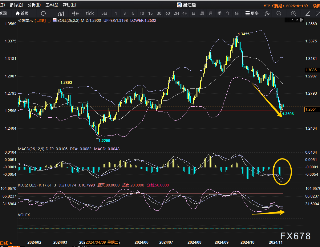 1)经过近期暴跌之后,汇价已处在数月低点水平支撑位,今日虽有下探但连续三日守住了1.2600附近的低点。昨日阳线对其前一交易日的阴线也是形成阳包阴形态,表明多头的反弹很有力。KDJ与K线形成看涨背离,MACD下跌动能柱在缩短。