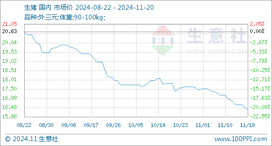 11月20日,生意社生猪基准价为16.40元/公斤,与本月初(17.47元/公斤)相比,下降了-6.12%。