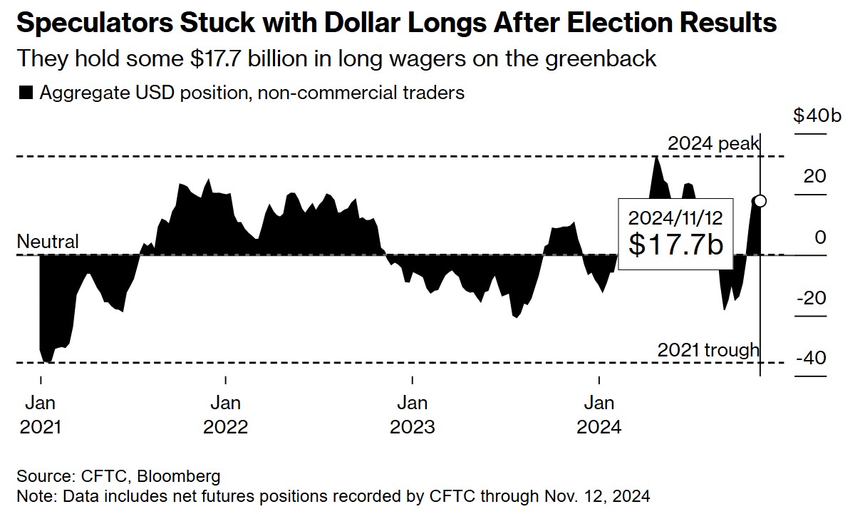当然,华尔街的许多人仍在宣扬美元走强的理由。对冲基金、资产管理公司和其他投机者一直在为进一步上涨做准备。根据美国商品期货交易委员会截至11月12日当周的最新数据,他们持有约177亿美元的合约,这些合约有望从美元走强中受益。