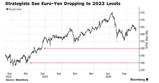 荷兰合作银行(Rabobank)、野村证券公司(Nomura Securities Co.)和瑞穗证券公司(Mizuho Securities Co.)的策略师都认为,到明年年底,欧元兑日元将跌至140至150的低点。自2023年6月以来,它从未出现在这一范围内,目前徘徊在164左右。