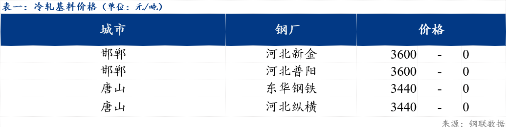 今日北方市场冷轧基料3.0*1010*CSPHC河北普阳价格为3600元/吨,较上一期价格持稳,河北纵横价格为3440元/吨,较上一期价格持稳。镀锌方面,今日北方市场民营镀锌钢厂指导价格表现不一。市场方面,北方市场淡季效应明显,贸易商操作上以出货为主,采购计划谨慎,部分冷轧资源流向南方,贸易商报价大部分存在议价空间,对后市行情持谨慎心态看待。