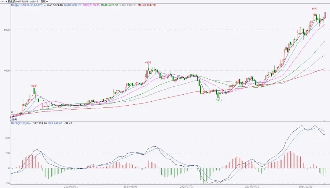 11月20日氧化铝主力2501合约再度上行,逼近近期前高,截止下午收盘报5430,涨幅3.76%。