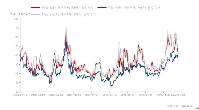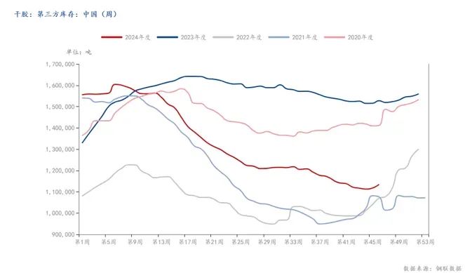 (1)主产区产量释放,供应预期增加。国内云南产区临近停割,但东南亚主产区目前仍处于产胶旺季,原料价格处于同期偏高水平,海外割胶积极性预计偏强,叠加近期天气正常,天然橡胶短期预计增加趋势不变。