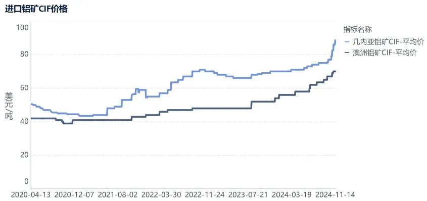 (1)供应方面,10月我国进口铝矿砂及其精矿1229万吨,环比+6%,同比+11%,不过几内亚铝土矿供应扰动仍存,矿山GAC面临永久关闭的风险,而国内北方铝土矿山迟迟未大规模复产,矿端紧缺限制国内氧化铝产能的提升,叠加北方重污染天气预警影响,氧化铝现货市场依旧紧缺。