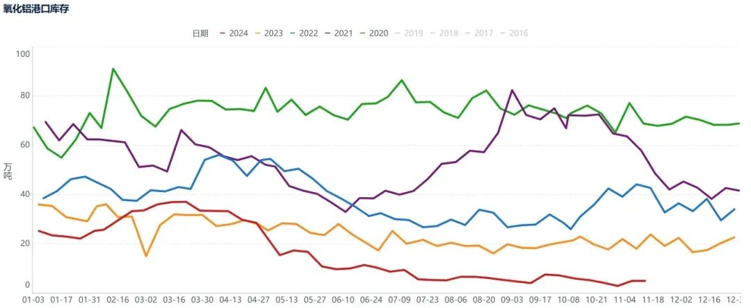 (3)库存方面,截至11月15日,国内港口氧化铝库存为5.05万吨,较节前一周持平,仍偏低。