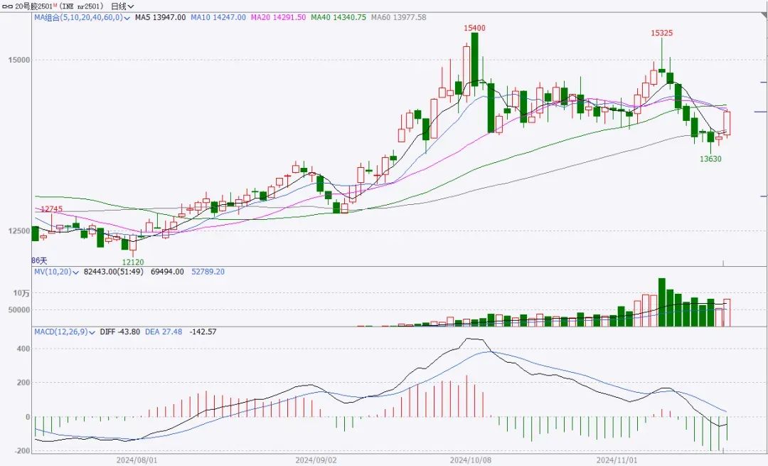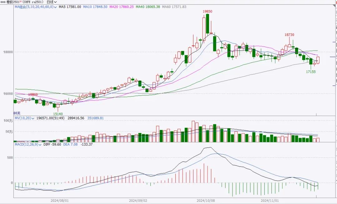 天然橡胶主力合约在连续收跌6日后迎来一波上行,RU橡胶2501今日收盘报17765元/吨,涨幅1.92%,20号胶2501收盘报14245元/吨,涨幅2.67%。
