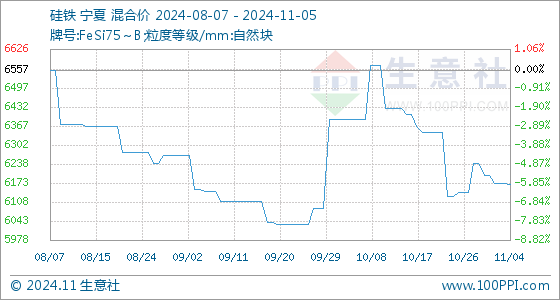 11月5日,生意社硅铁基准价为6168.57元/吨,与本月初(6200.00元/吨)相比,下降了-0.51%。