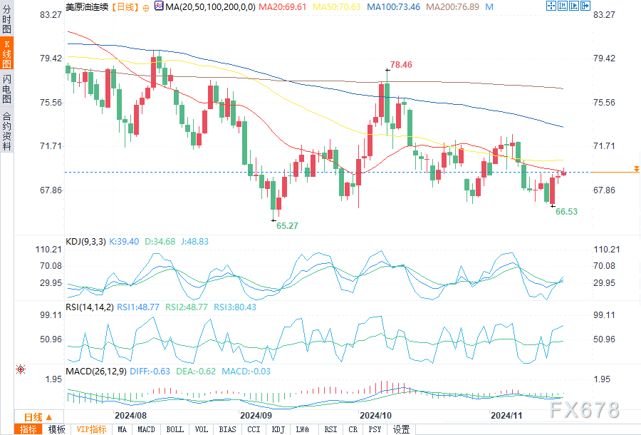预计今天的交易区间在68.20美元的支撑位和71.20美元的阻力位之间。北京时间19:36,WTI原油报69.61美元/桶,涨幅0.53%。