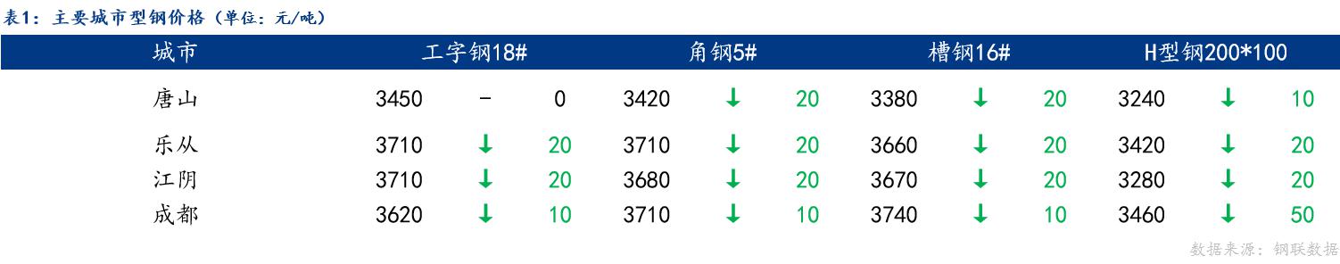 今日型钢价格稳中趋弱运行,唐山角钢、槽钢、H型钢价格较上一交易日,下跌10-20元/吨;乐从江阴成都工字钢、角钢、槽钢、H型钢价格较上一交易日,下跌10-50元/吨。