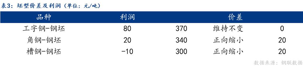 从坯型价差来看,角钢槽钢与钢坯价差正向缩小。