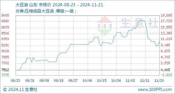 11月21日,生意社大豆油基准价为8304.00元/吨,与本月初(8466.00元/吨)相比,下降了-1.91%。