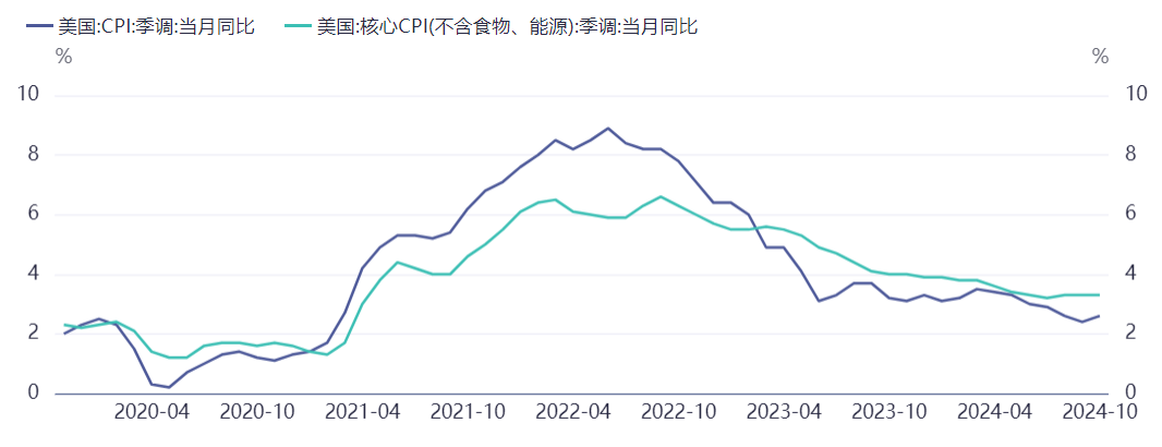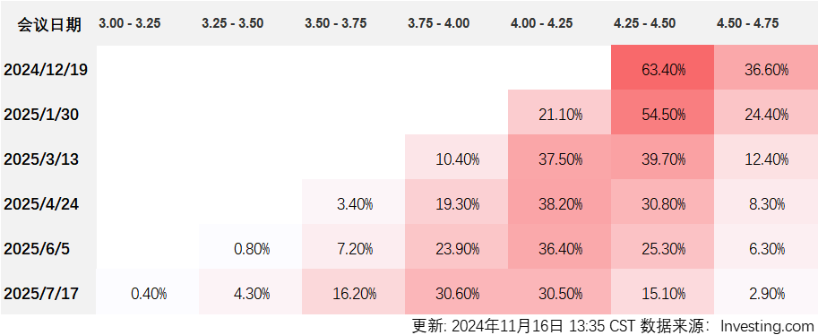 近期,美联储主席鲍威尔称,劳动力市场指标回到与美联储充分就业目标一致的更正常水平;通胀将继续朝目标2%下降,尽管时而会出现颠簸;近期美国经济表现“相当好”,给了美联储谨慎降息的空间,降息不急于一时,而且美联储有时间先了解评估未来特朗普出台政策的经济影响,再作出反应。当前,市场预期12月美联储降息25基点,明年可能还有50基点降息空间。