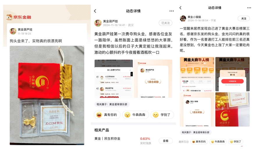 作为行业首个向用户开放积存金实盘操作的平台,京东金融与民生银行、浙商银行等金融机构携手合作,不仅确保了资金的安全,还促进了黄金资产从单一保值向多元增值的转变。目前,在京东金融社区,已有数万用户开启实盘交易功能,构建了一个包含新手和资深投资者在内的百万级金友交流平台。数据显示,在日前举办的京东金融黄金实盘大赛第三季中,总参赛人数较上一季增长约65%,其中有4人累计买金超三千万,10人累计买金超两千万,有106位金友拿下狗头金。通过实盘pk的形式也给普通投资者们带来学习的机会。