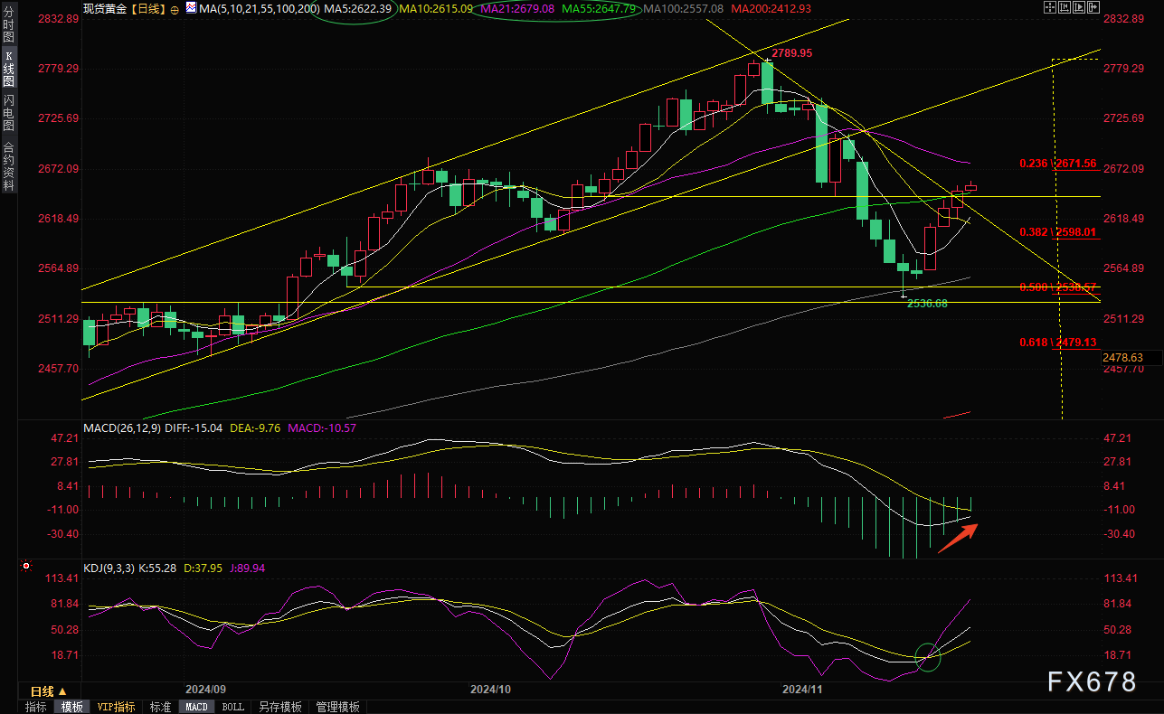 现货黄金技术面来看,日线级别,金价顶破了下行趋势线和55日均线双重阻力,KDJ金叉良好运行,5日均线初步上穿10日均线,后市看涨信号有所增强,若能坚守在55日均线2647.80上方,则后市有望进一步试探21日均线2679.10附近阻力。