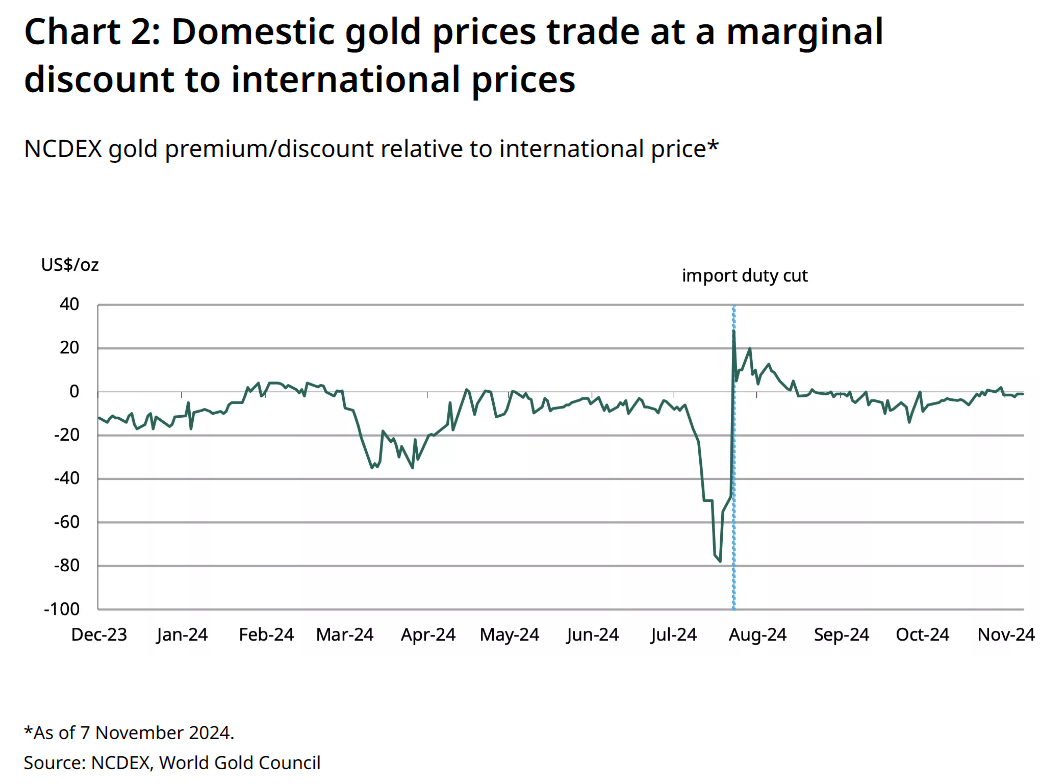 Chacko还补充到,在10月底排灯节高峰期,印度金价与国际金价基本持平,甚至出现了微幅溢价,这反映了更高的需求水平。平均月度价差从9月的每盎司5美元收窄至10月的2.8美元,在11月第一周进一步收窄至每盎司1美元。
