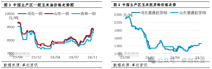 本周玉米油均价小涨,但趋势下滑;玉米胚芽粕均价稳定。本周豆油价格整体偏弱,叠加原料玉米胚芽价格出现滞涨下跌,利空玉米油市场;市场观望氛围浓厚,走货不佳。玉米胚芽粕价格调整有限,企业库存暂无压力,执行前期订单为主,市场价格整体稳定。据卓创资讯统计,本周一级玉米油国内均价9215元/吨,较前一周均价上涨0.16%;本周玉米胚芽粕周均价1425元/吨,较前一周均价稳定。