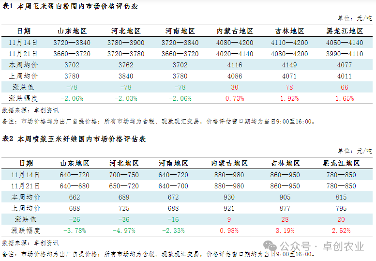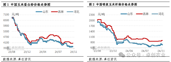 本周玉米蛋白粉市场价格整体下滑。本周豆粕现货价格偏弱调整,豆粕与玉米蛋白粉单蛋白价差不断缩小,玉米蛋白粉价比暂无优势;下游需求谨慎观望,采购积极性不佳,深加工企业开工高位,库存上升,市场价格整体下滑。据卓创资讯统计,本周国内玉米蛋白粉均价3918元/吨,较上周跌10元/吨,跌幅0.25%。具体市场价格,山东、河北市场玉米蛋白粉主流报价在62-66元/蛋白,成交价格参考61-63元/蛋白,跌1-2元/蛋白。东北及内蒙古市场价格跟跌,黑龙江主流成交66.5-68.5元/蛋白,跌0.5-1.0元/蛋白,吉林地区主流参考68-70元/蛋白,低价跌0.5元/蛋白,内蒙古地区主流成交67-69元/蛋白,跌1元/蛋白。